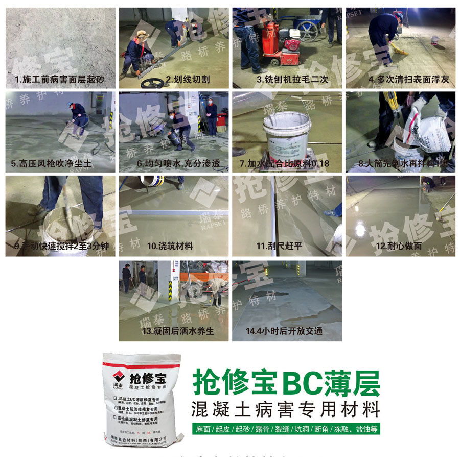 出現(xiàn)這些問題的主要原是因?yàn)槭┕べ|(zhì)量和產(chǎn)品本身的使用壽命問題,那么針對這種問題,地坪在修補(bǔ)處理基層時(shí)應(yīng)該選擇什么材料呢?首先應(yīng)考慮快速材料,因?yàn)槭堑叵峦\噲觯囕v需要頻繁進(jìn)入駛出;其次針對起塵、起砂、脫落的微表處病害,選擇針對微表處病害的修補(bǔ)材料。搶修寶BC薄層就是一個(gè)不錯(cuò)的選擇,材料本身強(qiáng)度高,內(nèi)含進(jìn)口膠粉,可以和病害部位嚴(yán)絲合縫的結(jié)合起來,其次加入了進(jìn)口添加劑,材料可以30分鐘完成初凝,2-4小時(shí)就可以恢復(fù)交通,解決了車輛進(jìn)出頻繁引起的交通擁堵,是地坪修補(bǔ)基層處理的的不錯(cuò)的選擇!
