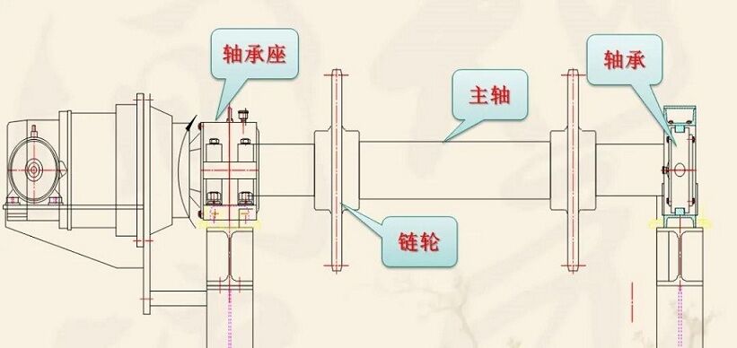 該裝置主要由軸、鏈輪、支承輥等件組成。兩端支撐為滾動(dòng)軸承,主軸與減速器、空心軸套裝在一起,通過(guò)鎖緊盤(pán)將其二者連接到一起,達(dá)到傳遞扭矩的要求,結(jié)構(gòu)緊湊。