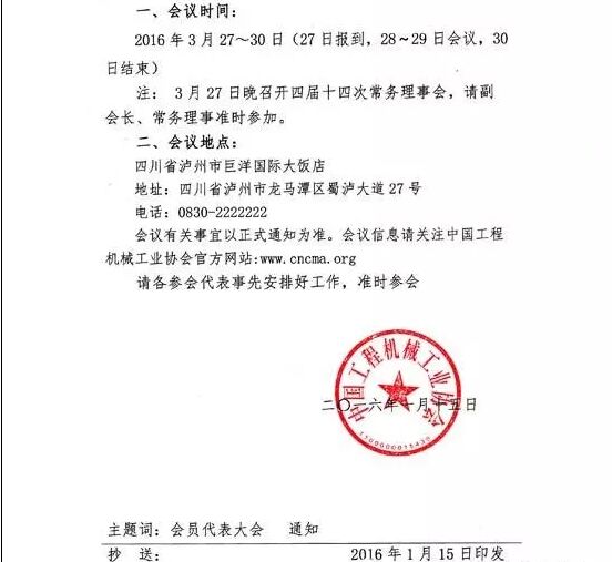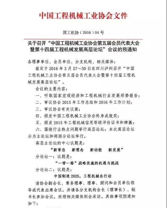 茲定于2016年3月27日~30日在四川瀘州召開(kāi)“中國(guó)工程機(jī)械工業(yè)協(xié)會(huì)第五屆會(huì)員代表大會(huì)暨第十四屆工程機(jī)械發(fā)展高層論壇”。